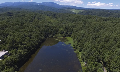 面積20,000㎡の美笹湖(標高995m)周辺に広がる、自然観察園74,000㎡(7.4ha。)正面奥は蓼科山。