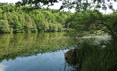 面積20,000㎡の美笹湖(標高995m)周辺に広がる、自然観察園74,000㎡(7.4ha。)正面奥は蓼科山。