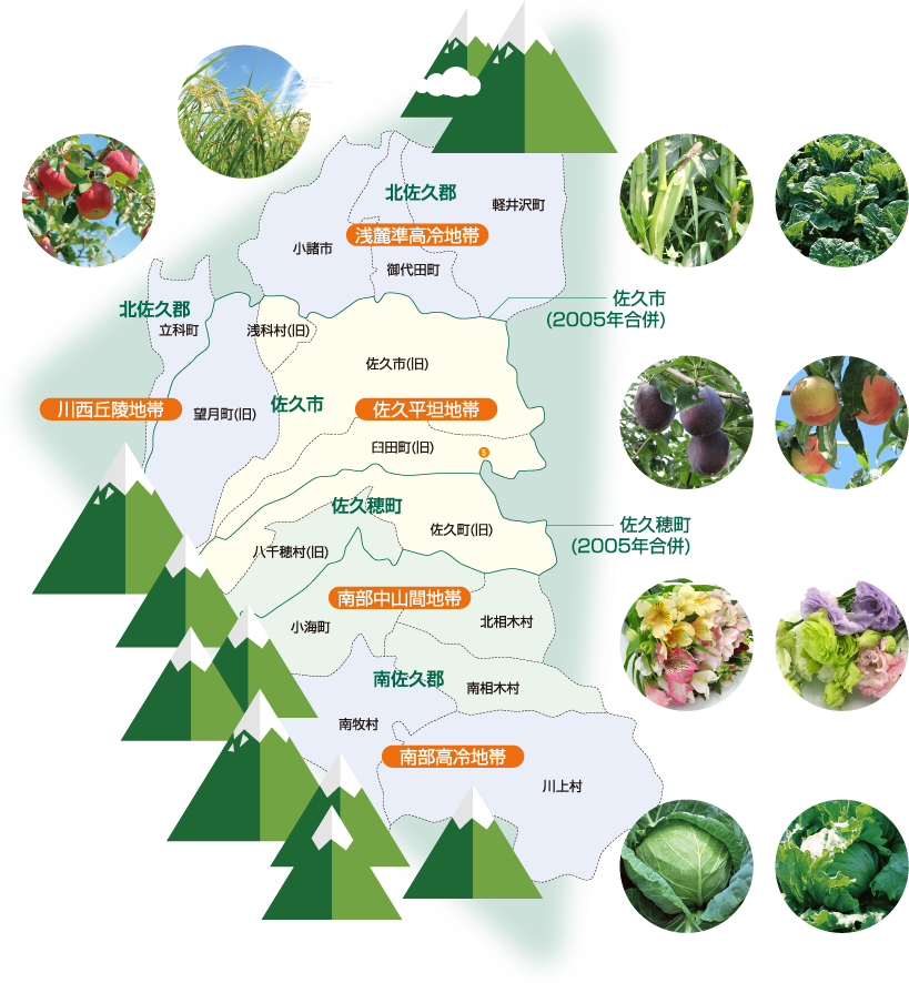 同じ佐久地域内でも、気候や土壌の違いから5つのエリアに分けられ、それぞれに合った特長ある農産物が生産されています。